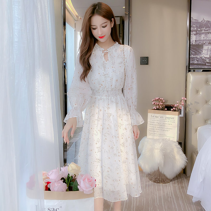 小样传奇 木耳边收腰打底连衣裙宽松显瘦复古碎花长裙